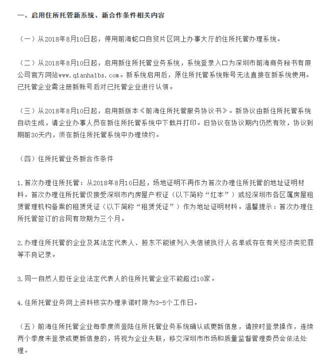 2、前海住所托管企业每季度须登陆住所托管业务系统确认或更新信息,请按时登录操作,连续两个季度未登录或更新信息的,将视为企业失联,移交深圳市市场和质量监督管理委员会依法处理;